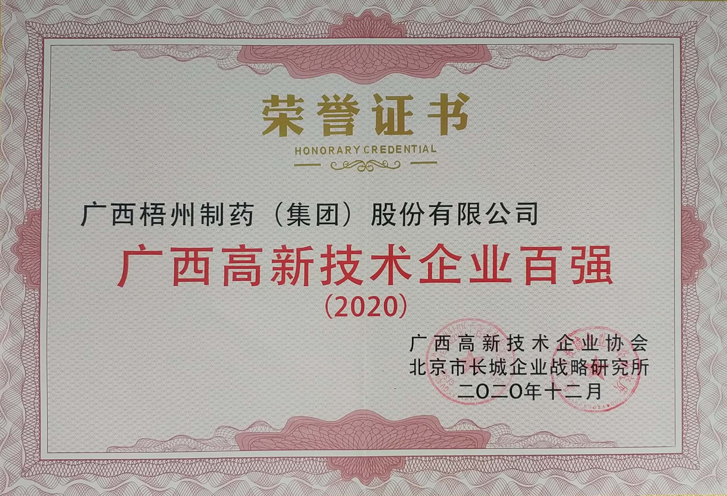 榮獲2020年廣西高新技術企業(yè)百強稱號