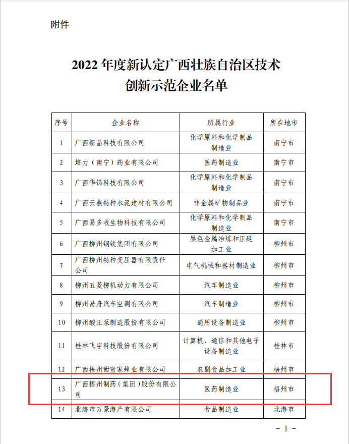 近日,廣西壯族自治區(qū)工業(yè)和信息化廳發(fā)布《自治區(qū)工業(yè)和信息化廳 自治區(qū)財政廳關于公布2022年度新認定廣西壯族自治區(qū)技術創(chuàng)新示范企業(yè)名單的通知》,梧州制藥榜上有名,獲評為2022年度“廣西壯族自治區(qū)技術創(chuàng)新示范企業(yè)”。