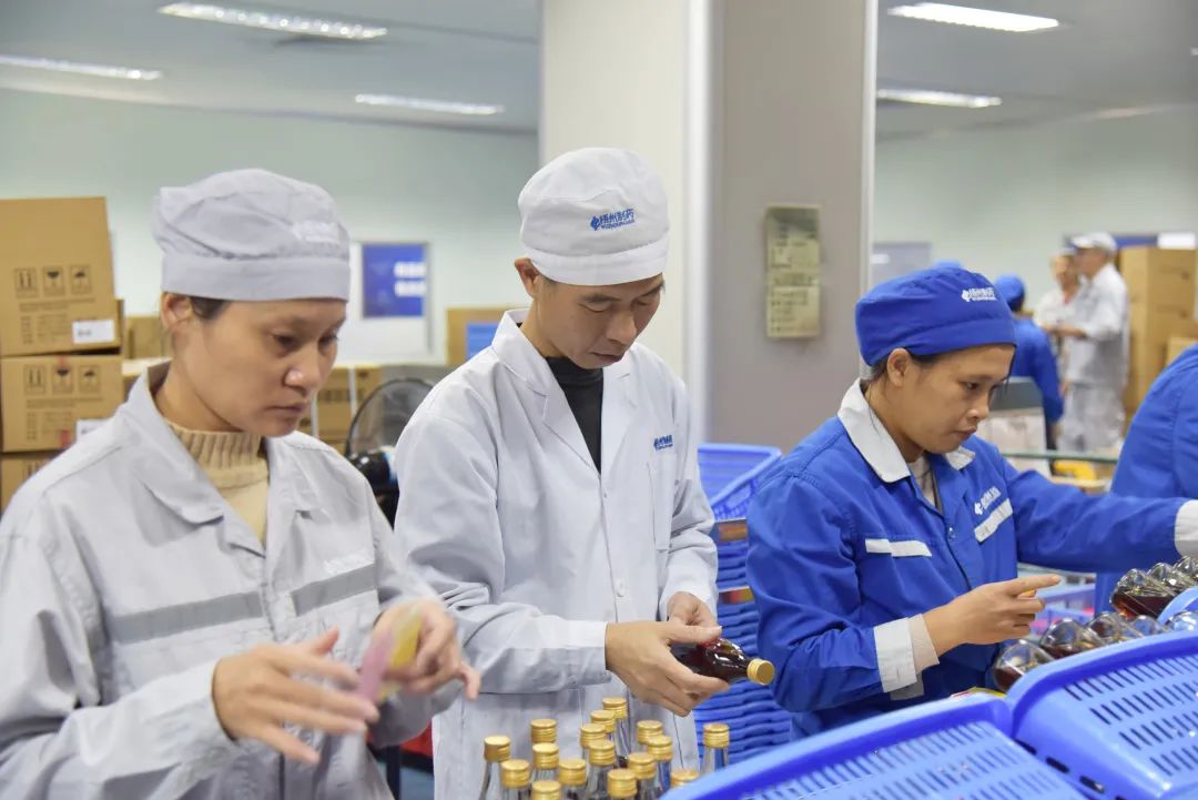 7:50配料開始,8:50灌裝間機器聲響起,9:00洗瓶間人員已經忙碌而有條不紊工作起來,待前端各工序正常運行后,他又往包裝區(qū)域巡場,“阿嬌,這張產品合格證印得不太清楚,換一張吧?!薄皟蓚€批號不一樣的,阿炳你搬箱時注意一下?!薄靶氯顺鮼碚У?,對于包裝不熟手很正常,產品需要多抽檢,新人亦要多提醒。”多年的工作經驗,讓他在巡檢中準確快速地根據當前狀態(tài)捕捉到質量控制關鍵點。