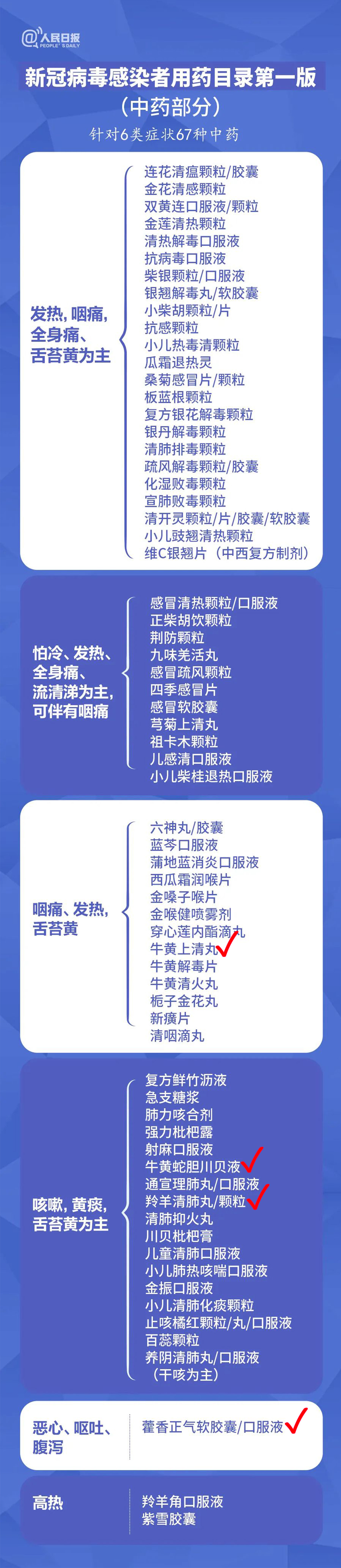 此版用藥目錄按照中西藥分開的原則,是對國家第九版診療方案中推薦用藥的完善和補充,針對發(fā)熱、咽痛等6類中醫(yī)診斷癥狀推薦67個中藥品種;針對咳嗽、咳痰等4類臨床癥狀推薦41個西藥品種。