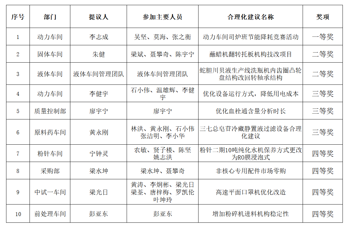 “一個項目就為公司節(jié)省燃氣費用約100萬余元。”“投入560元進行的小改造,每年能產(chǎn)生經(jīng)濟效益約5萬元。”“操作工提出的這個建議,有效延長了設(shè)備的使用壽命?!薄?, 2022年度“梧州制藥是我家,持續(xù)發(fā)展靠大家”合理化建議出效益活動評審結(jié)果出爐, 10條含金量十足的“好點子”喜獲嘉獎。