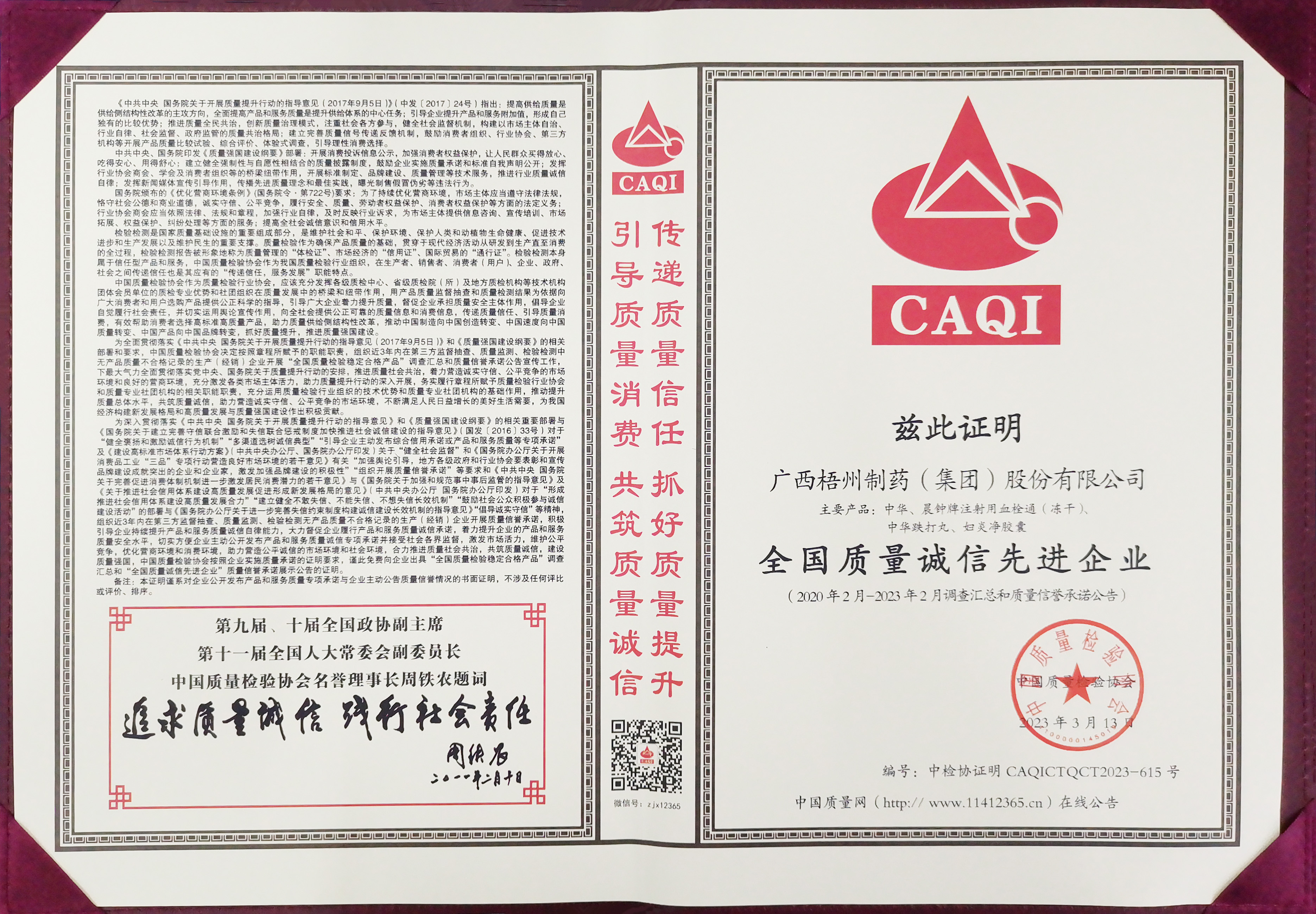 廣西梧州制藥(集團)股份有限公司榮獲2023年全國質(zhì)量誠信先進企業(yè)