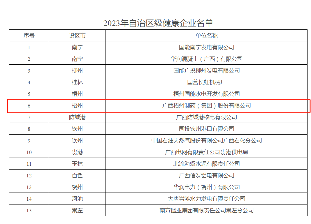 近日,廣西壯族自治區(qū)愛國衛(wèi)生運(yùn)動(dòng)委員會(huì)印發(fā)《自治區(qū)愛衛(wèi)辦關(guān)于公布2023年自治區(qū)級健康企業(yè)名單的通知》,其中,梧州制藥榜上有名,獲評“自治區(qū)級健康企業(yè)”稱號。
