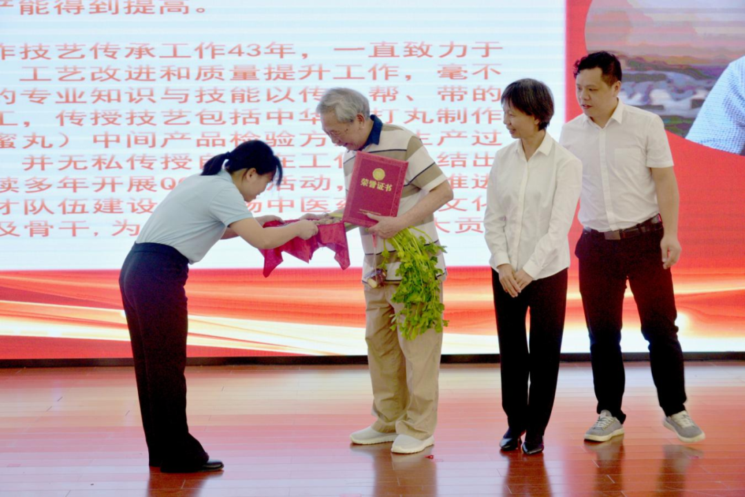 活動還專門邀請了中華跌打丸獻方人陳鐵的兒子,現(xiàn)已83歲高齡的原跌打丸生產(chǎn)車間主任陳永強到會,由公司黨委書記、董事長黃文彩為其頒發(fā)“中華跌打丸制作技藝——金牌師父”榮譽稱號。“中華跌打丸制作技藝”的第三、第四、第五代非遺傳承人依次上臺,同樣用傳統(tǒng)的束脩六禮對陳老進行了謝師,以此來表達對師父的感激之情、教導(dǎo)之恩。