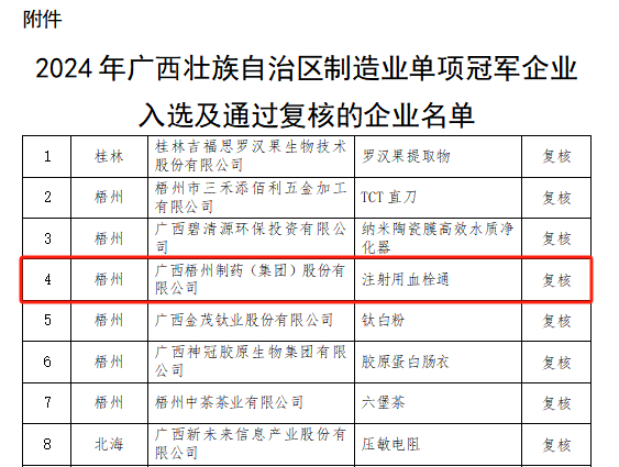 近日,廣西壯族自治區(qū)工業(yè)和信息化廳公布2024年廣西壯族自治區(qū)制造業(yè)單項冠軍企業(yè)名單,梧州制藥憑借著冠軍產(chǎn)品注射用血栓通卓越的技術能力和市場競爭力,順利通過了每三年一次的復核評價。