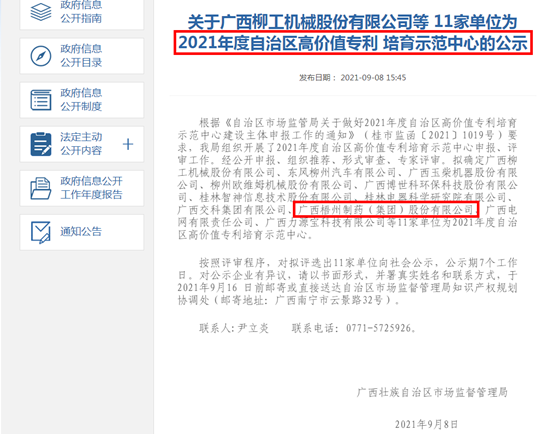 近期,廣西壯族自治區(qū)市場(chǎng)監(jiān)督管理局發(fā)布關(guān)于2021年度自治區(qū)高價(jià)值專利培育示范中心的公示名單,梧州制藥被確定為2021年度自治區(qū)高價(jià)值專利培育示范中心。建設(shè)高價(jià)值專利培育示范中心,